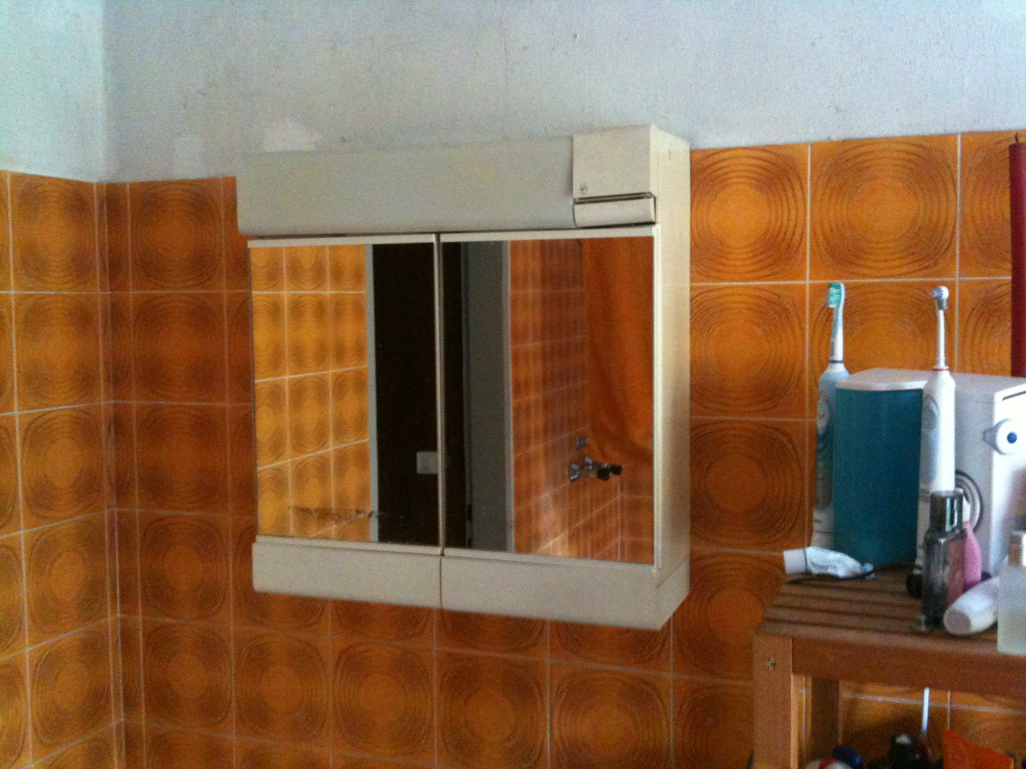 unten dran hat er zwo laden, von denen eine beliebte, ihren inhalt ins darunter befindliche waschbecken zu ergiessen, wenn mensch wieder mal vergass, dass die ladenzurueckhaltegegenhebelchen leider keine 35 jahre, sondern sagen wir nur zwoelf gehalten haben, und deshalb die lade nicht mehr ordnungsgemaess mit anschlag zurueckhielten, sondern dem ladenherauszieher eine ungewollte, weil grenzenlose freiheit des ladenherausziehens ermoeglichten.